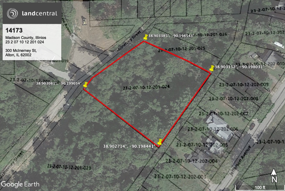 A tract of land in Gambrill's Subdivision of the Northeast Quarter of Section 1 O and the Northwest Quarter of Section 11 in Township 5 North, Range 10 West, in the City of Alton, County of Madison and State of Illinois, described as follows to wit: Beginning at a point on the Northwesterly side of a 15 foot alley running along the Northwesterly side of Block 1 of Riverview Addition to Alton, Illinois, said point being on a line with the dividing line between lots 16 and 17 of said Block 1, thence from said beginning point Northeasterly along the Northwesterly side of said alley, a distance of 240 feet to a point on a line with the dividing line between lots 10 and 11 of said Block 1; thence Northwesterly on a line with said dividing line a distance of 135.3 feet to a point in the Southeasterly line of a 50 foot road; thence Southwesterly along said road a distance of 97 feet to a point, said point being an angle in said road as same as shown by plat of subdivision as made by E.C. Mack on the date of 2-13-1928, thence from said point still in a Southwesterly direction along the Southeasterly line of said 50 foot road a distance of 154.5 feet to a point, said point being in a line with the dividing line between logs 16 and 17 of said Block 1 and at a distance of 350 feet Northwesterly from Jefferson Avenue, measured along said line; thence Southeasterly along said dividing line as extended a distance of 215 feet to the point of beginning; situated in the City of Alton in the County of Madison and the State of Illinois.